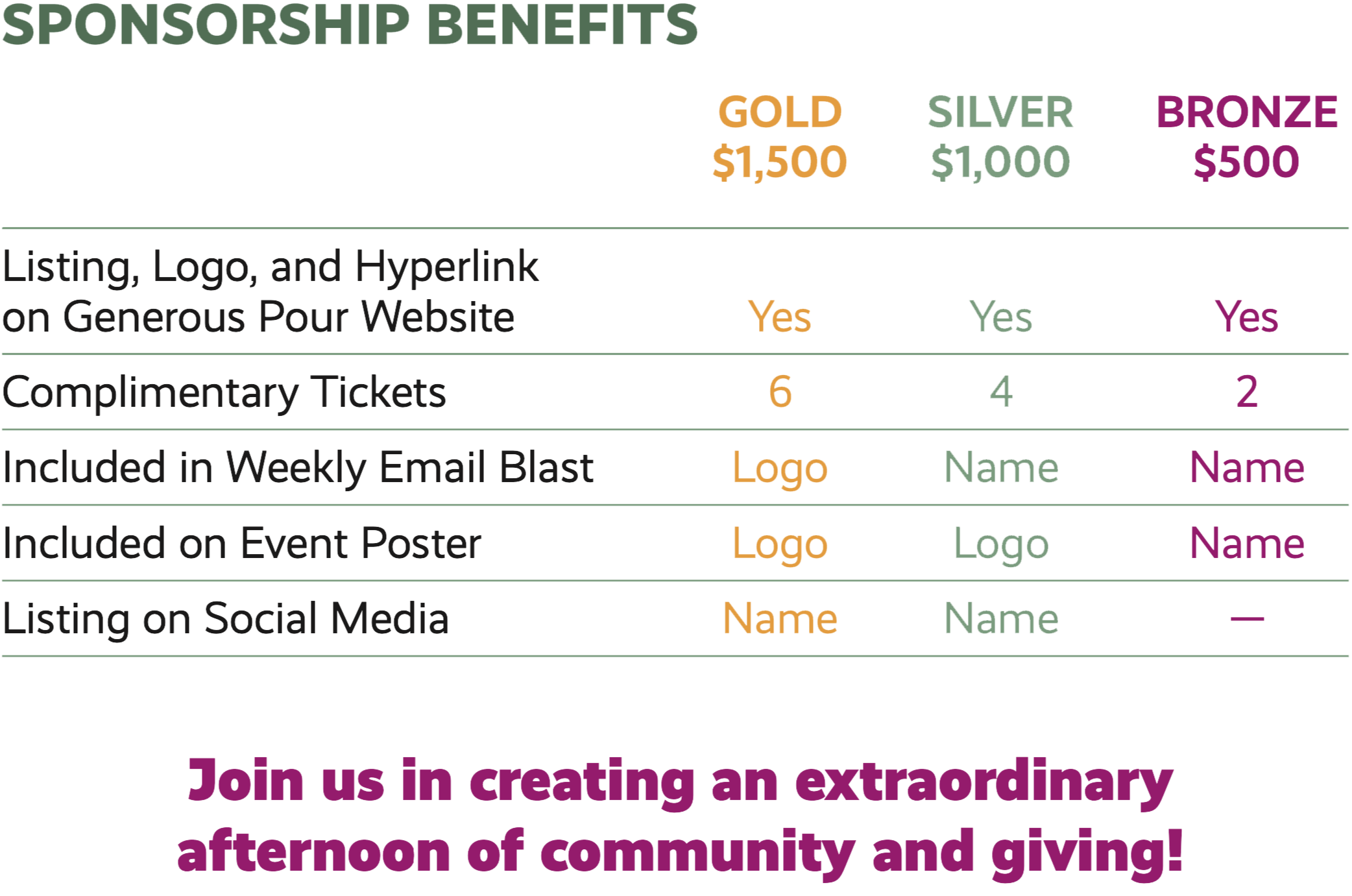 Sponsoring Generous Pour 2026 is more than supporting a great cause—it’s a way to give back to the community while promoting your business.